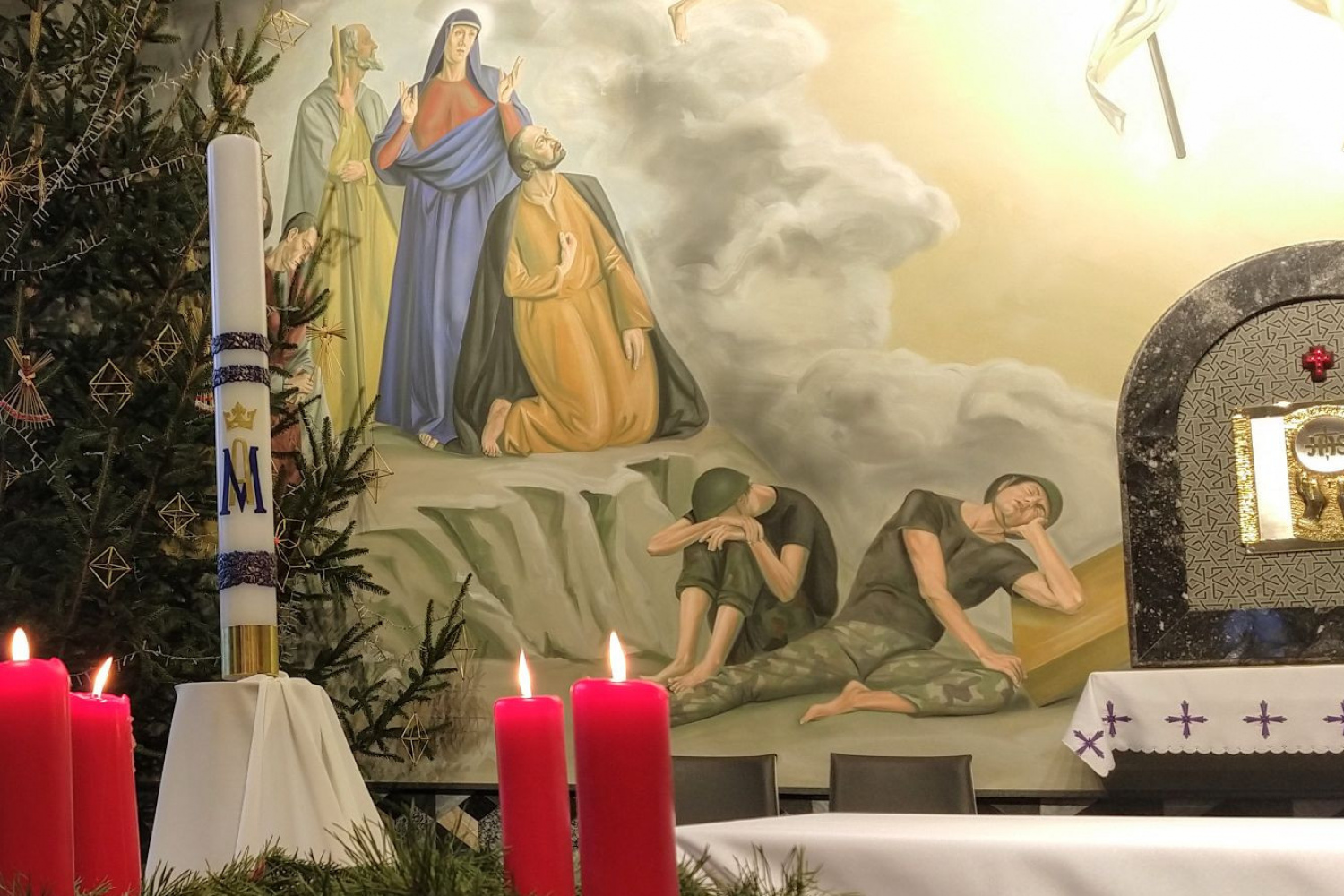 Гэты элемент фрэскі меў такі сэнс: святло пераможа цемру не дзякуючы мілітарнай сіле, але насуперак ёй, калі салдаты заснуць. «Фрэску адцэнзуравалі ў той час, калі ў ідэалогіі беларускай дзяржавы ўзмацніўся культ мілітарызму — пасля 2020 года. Наколькі вядома вернікам, распараджэнне замаляваць фігуры без узгаднення з аўтарам фрэскі паступіла ад біскупа Віцебскага Алега Буткевіча. Аднак невядома, ці з ягонай ініцыятывы гэта адбылося. Мастацкае рашэнне інтэр’ера касцёла, асвечанага ў 2017 годзе, раней узгаднялася з біскупам», — нагадвае Katolik.life.