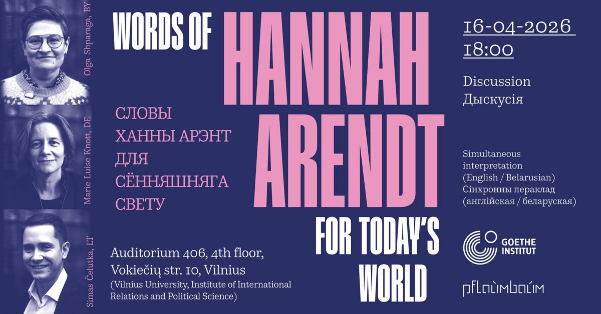 16 красавіка ў Інстытуце міжнародных адносін і палітычных навук Віленскага ўніверсітэта адбудзецца дыскусія «Словы Ханны Арэнт для сённяшняга свету». Нагодай для сустрэчы стаў выхад новага зборніка эсэ палітычнай філосафкі ў перакладзе на беларускую мову ад выдавецтва«Пфляўмбаўм».