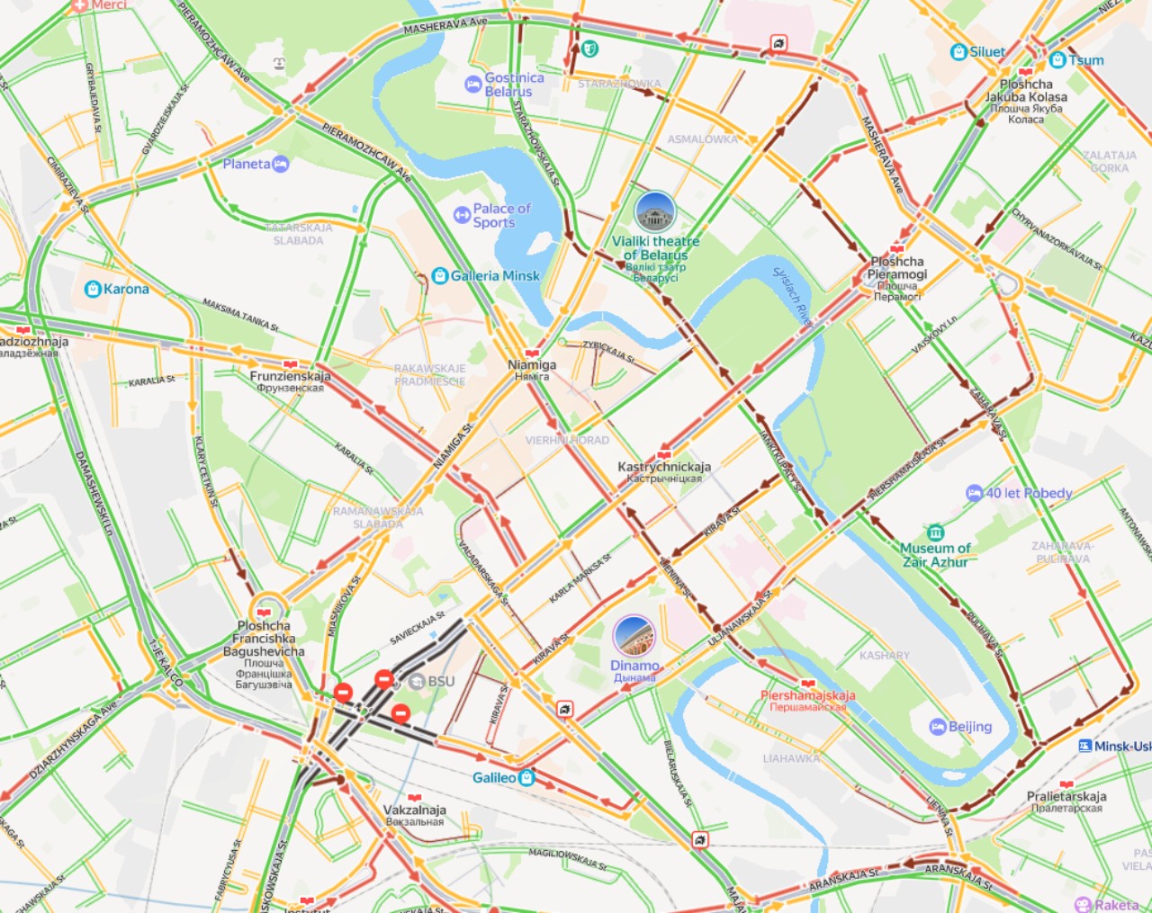 Вечером 7 марта в Минске наблюдаются девятибалльные пробки. Наиболее тяжелая ситуация — на улицах Первомайская, Кирова, Ленина, Купалы, Пулихова, Захарова.