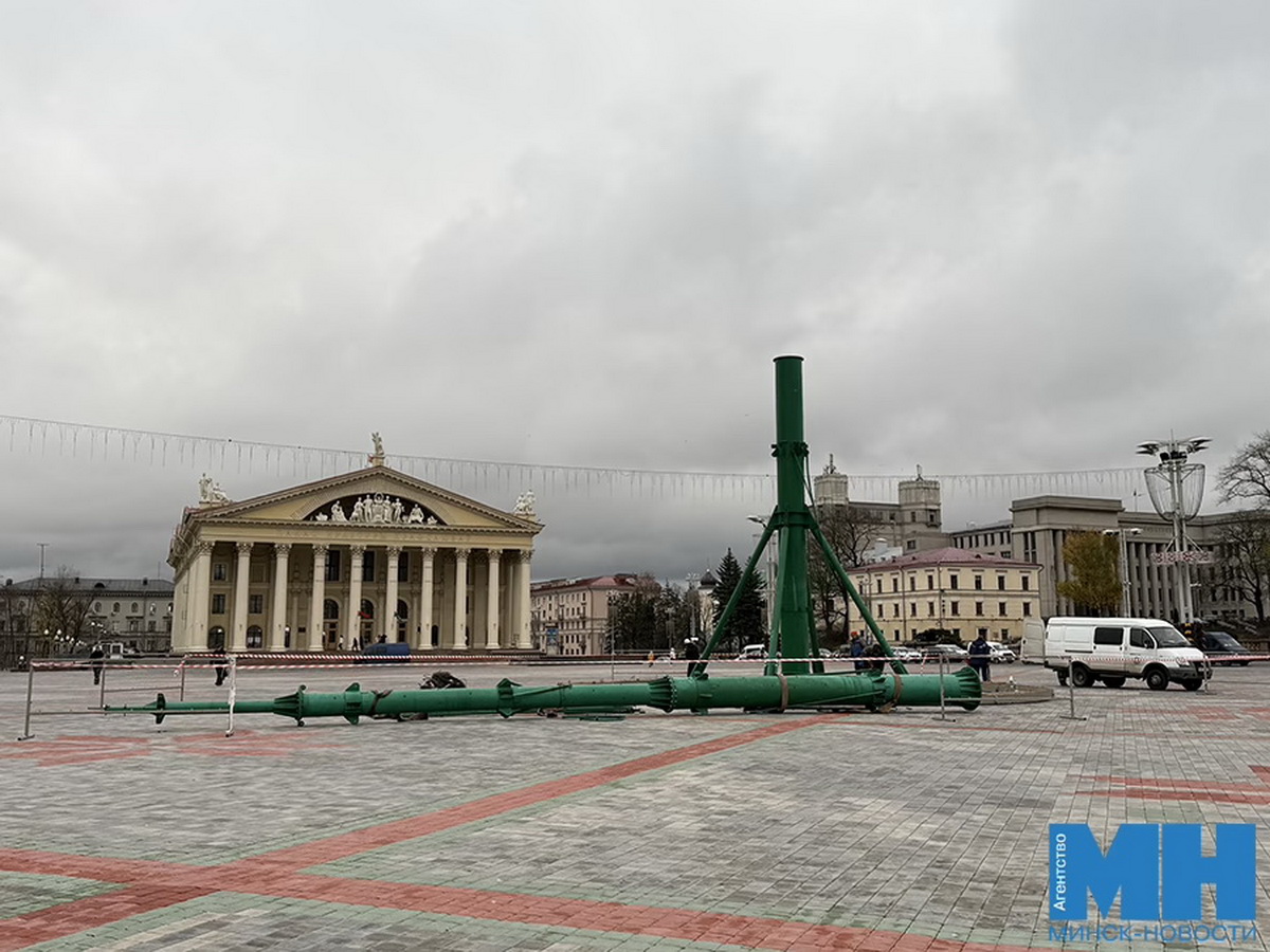 На Октябрьской площади в Минске начали устанавливать главную новогоднюю елку страны, пишет «Минск-Новости».