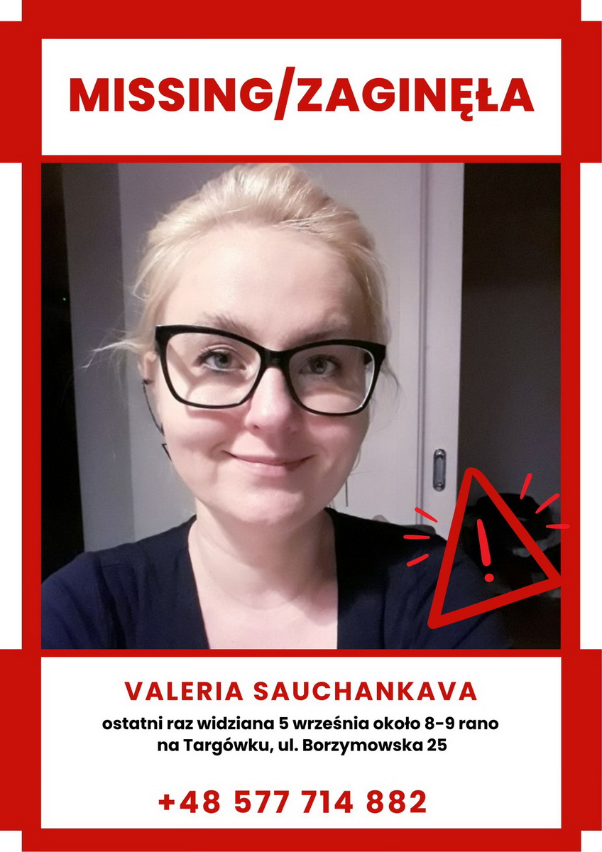 В Варшаве ищут пропавшую 38-летнюю беларусскую активистку Валерию Савченкову. Известно, что 5 сентября в 8-9 утра она находилась в районе Таргувек, на улице Божымовска, 25 (Бродновское кладбище, станция метро Троцкая). С тех пор информации о ней нет.