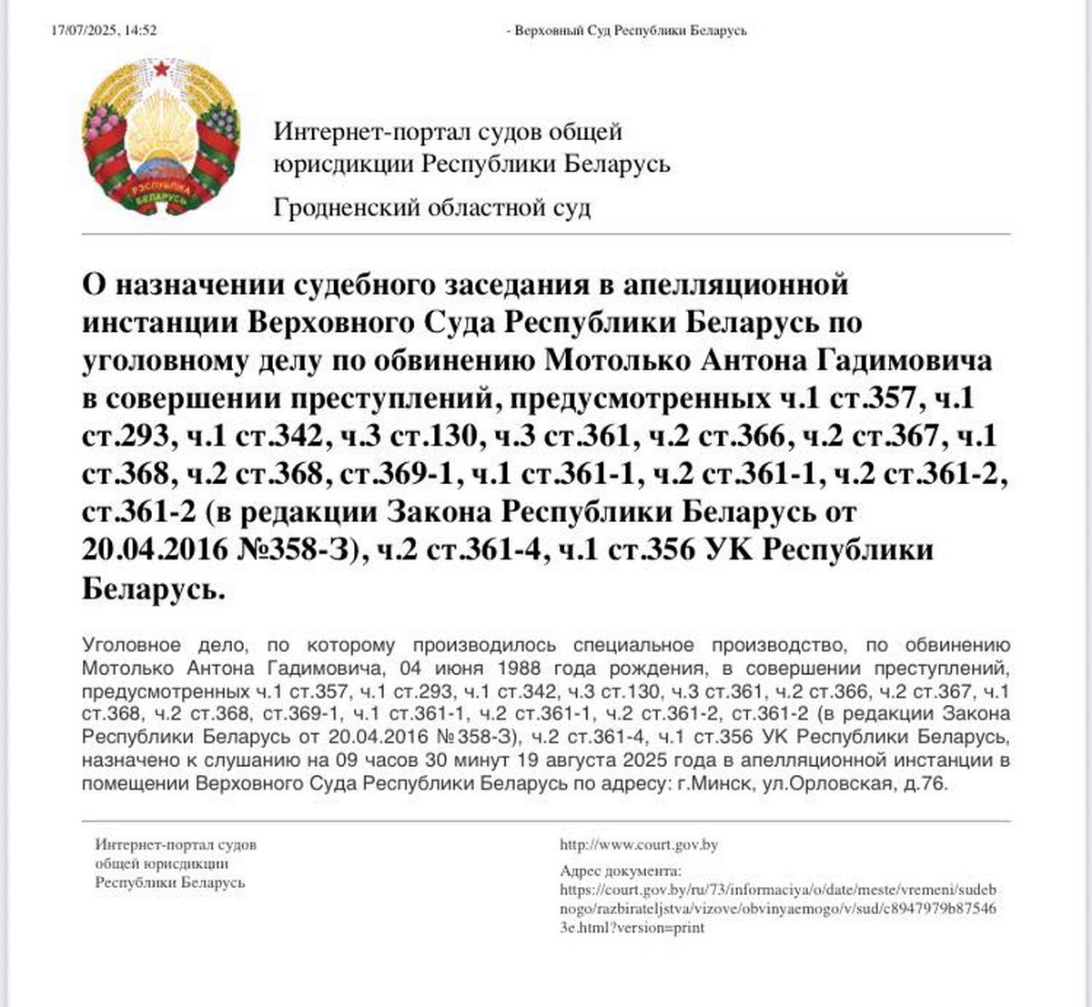 Напомним, 3 июня Гродненский областной суд заочно приговорил блогера Антона Мотолько к 20 годам лишения свободы со штрафом в размере 2000 базовых величин (84 тыс. рублей).