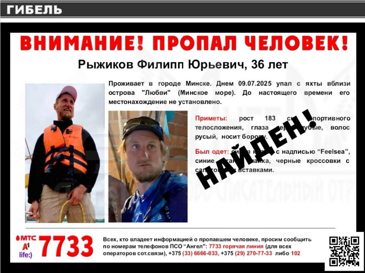 Речь идет о Филиппе Рыжикове, который 9 июля выпал с яхты вблизи «Острова любви» на Минском море. Поисковые мероприятия проводились на Минском море три дня. В них были задействованы поисковики, дайверы и волонтеры ПСО «Ангел» с сонарами, сотрудники милиции, водолазы, МЧС, ОСВОД, РОСН «Зубр», ПАСО Молодечно, РОЧС агрогородка Ждановичи, родные и близкие мужчины.