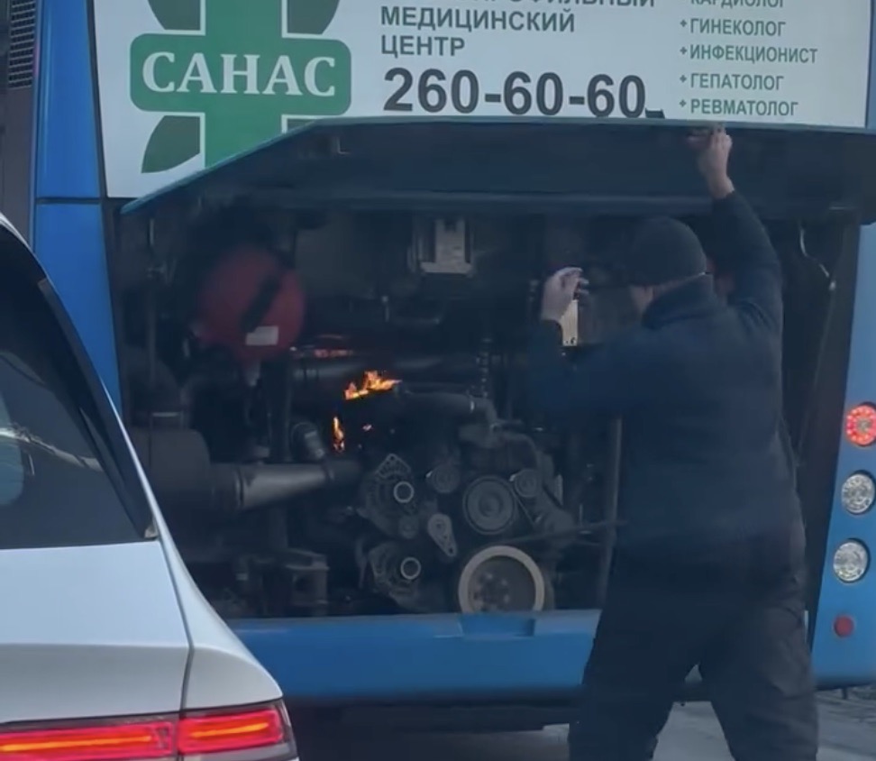 1 февраля автобус маршрута 24к стоял на светофоре, когда в моторном отсеке вспыхнуло пламя. Водитель автобуса, не глуша двигатель, потушил огонь голыми руками и продолжил движение. Пассажиры в это время оставались в салоне.