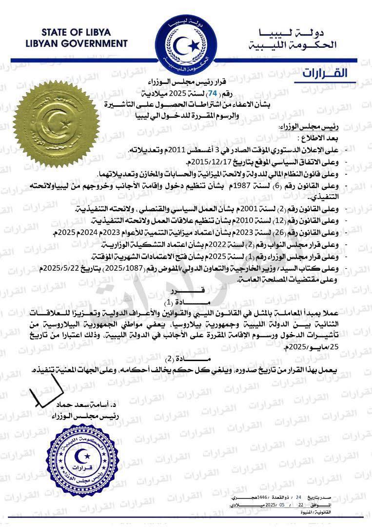 «В рамках взаимности, основанной на ливийских законах и международном праве, и для укрепления двусторонних отношений между Государством Ливия и Республикой Беларусь, граждане Республики Беларусь освобождаются от необходимости получения визы и оплаты визовых сборов для въезда в Государство Ливия. Это начинает действовать с 25 мая 2025 года», — говорится в постановлении, текст которого был опубликован в блоге политика на Facebook.