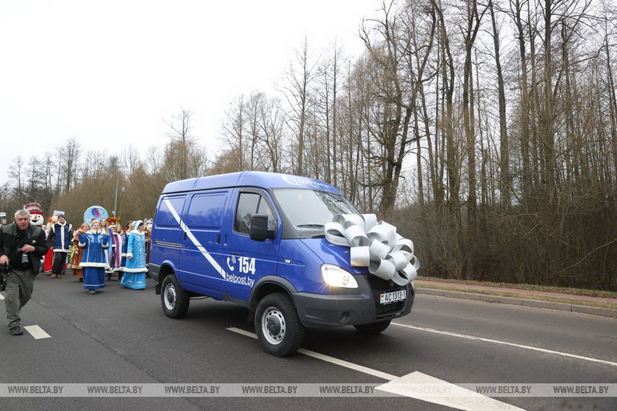 Шествие оркестра Деда Мороза и «творческих коллективов» вместе с медленно движущимся автомобилем «Белпочта» стартовало от здания почты в агрогородке Каменюки и направилось к главным воротам парка.