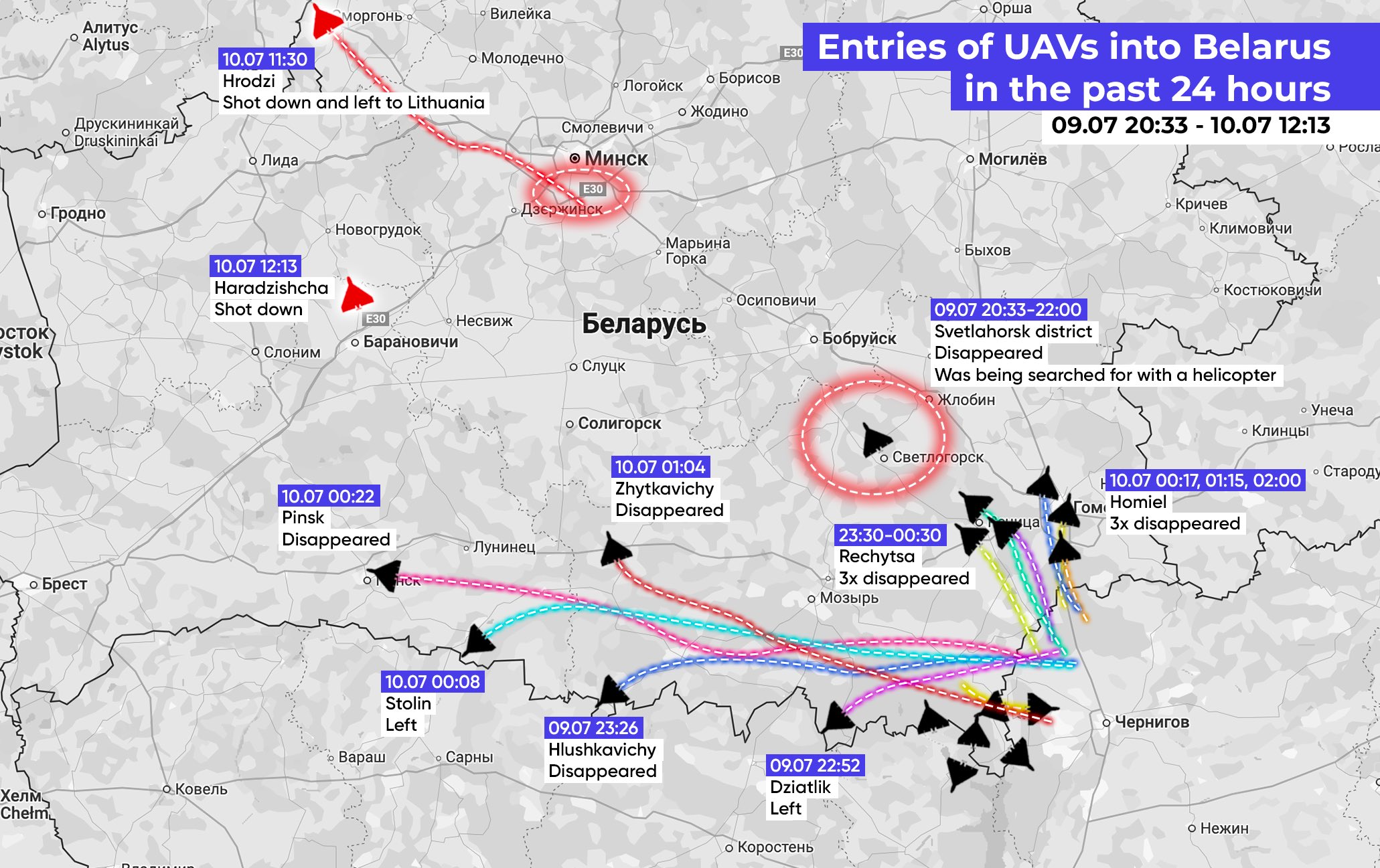 С вечера 9 июля в Беларусь залетели не менее 20 дронов. Из них 5 вернулись в Украину, 13 исчезли, 2 разбились или были сбиты беларусскими ВС.