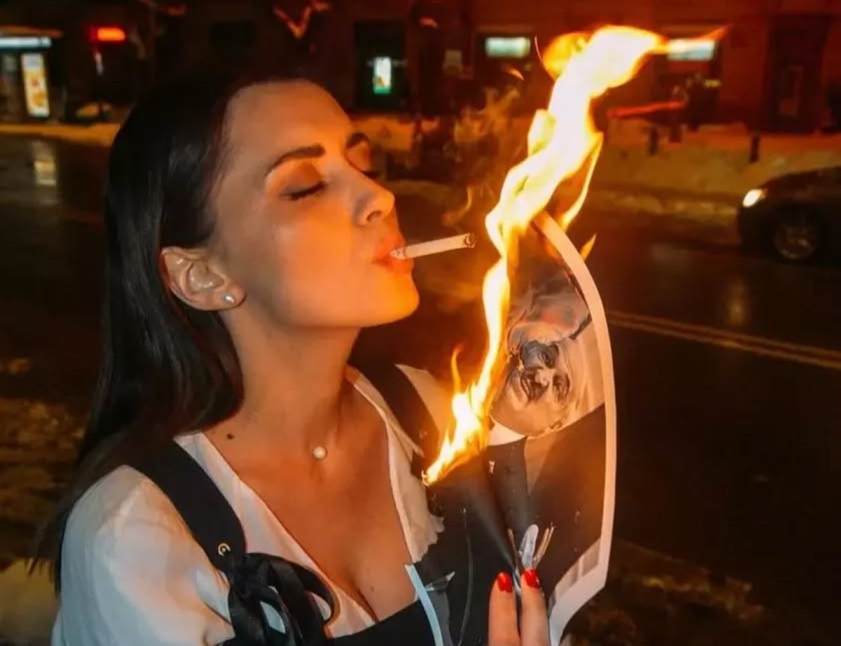 Сёння феміністка і вядучая «Обычного утра» Марына Ментусава ў сваім інстаграме апублікавала фотаздымкі, на якіх падпальвае цыгарэту ад палаючага партрэта Аляксандра Лукашэнкі.