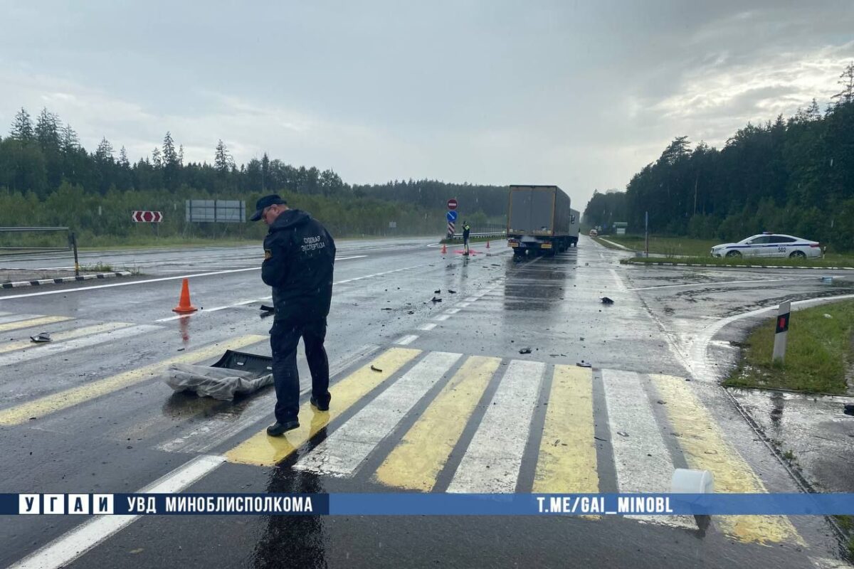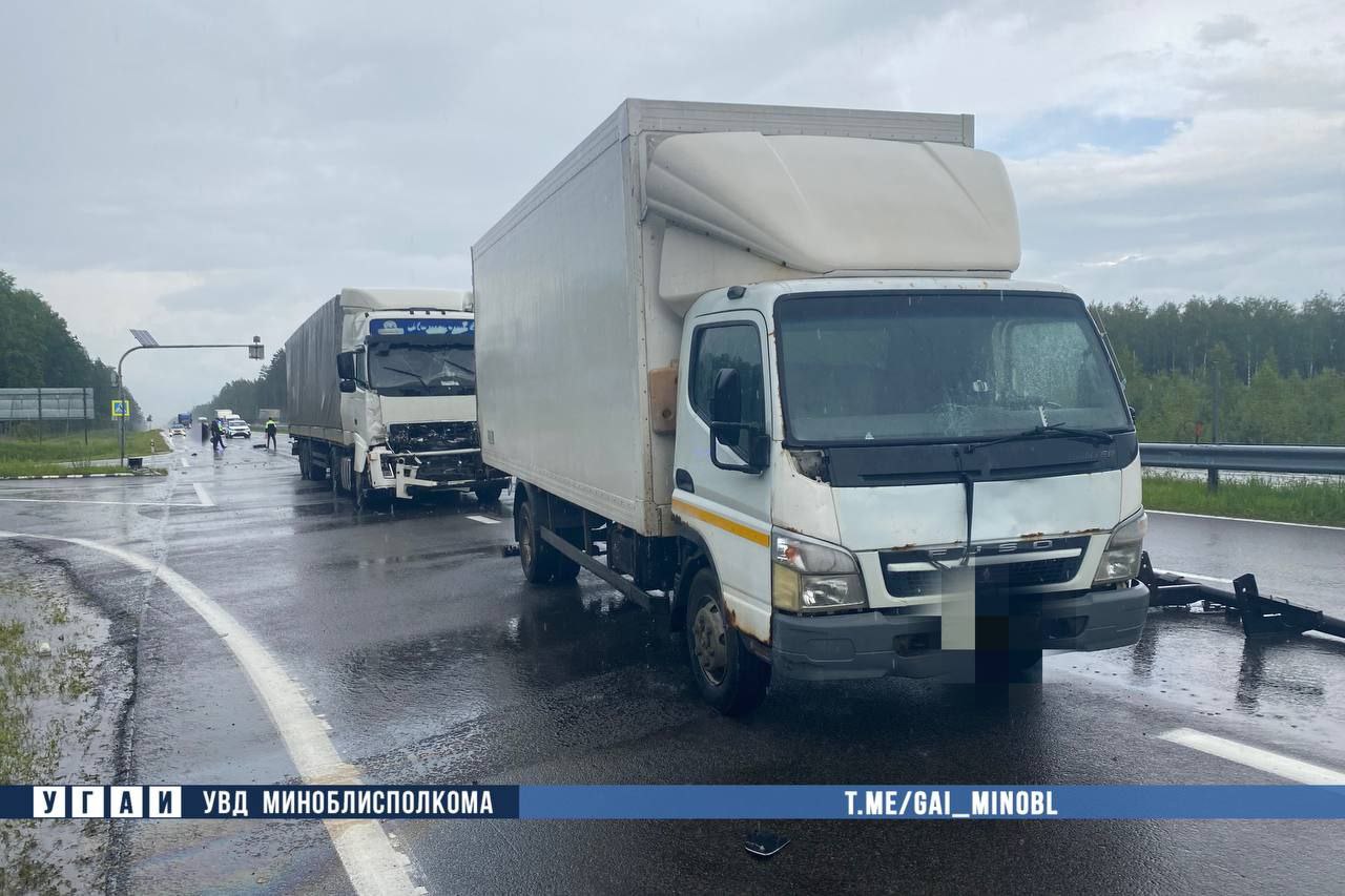 Около 14:15 фура Volvo под управлением 51-летнего водителя двигалась в направлении Минска по крайней правой полосе и врезалась в стоявший перед нерегулируемым пешеходным переходом грузовик Mitsubishi, за рулем которого находился 26-летний водитель.