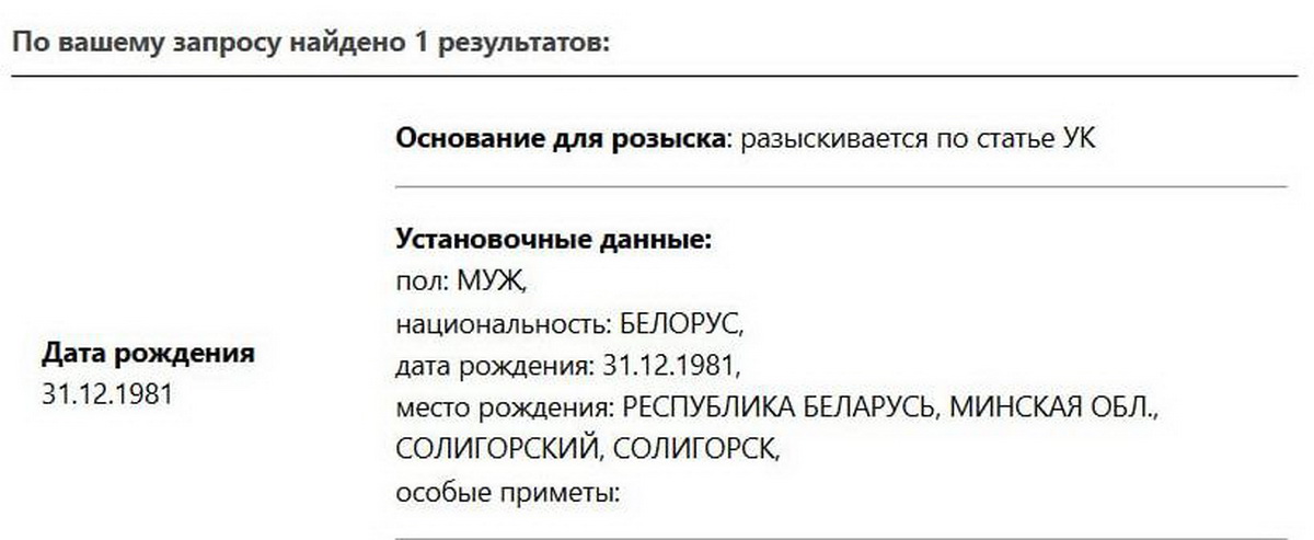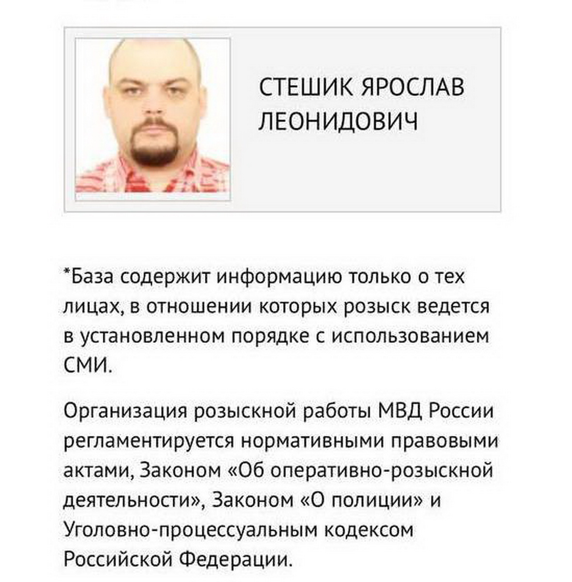 В карточке базы российского МВД указано, что Стешик разыскивается «по статье УК». По какой именно, не уточняется.